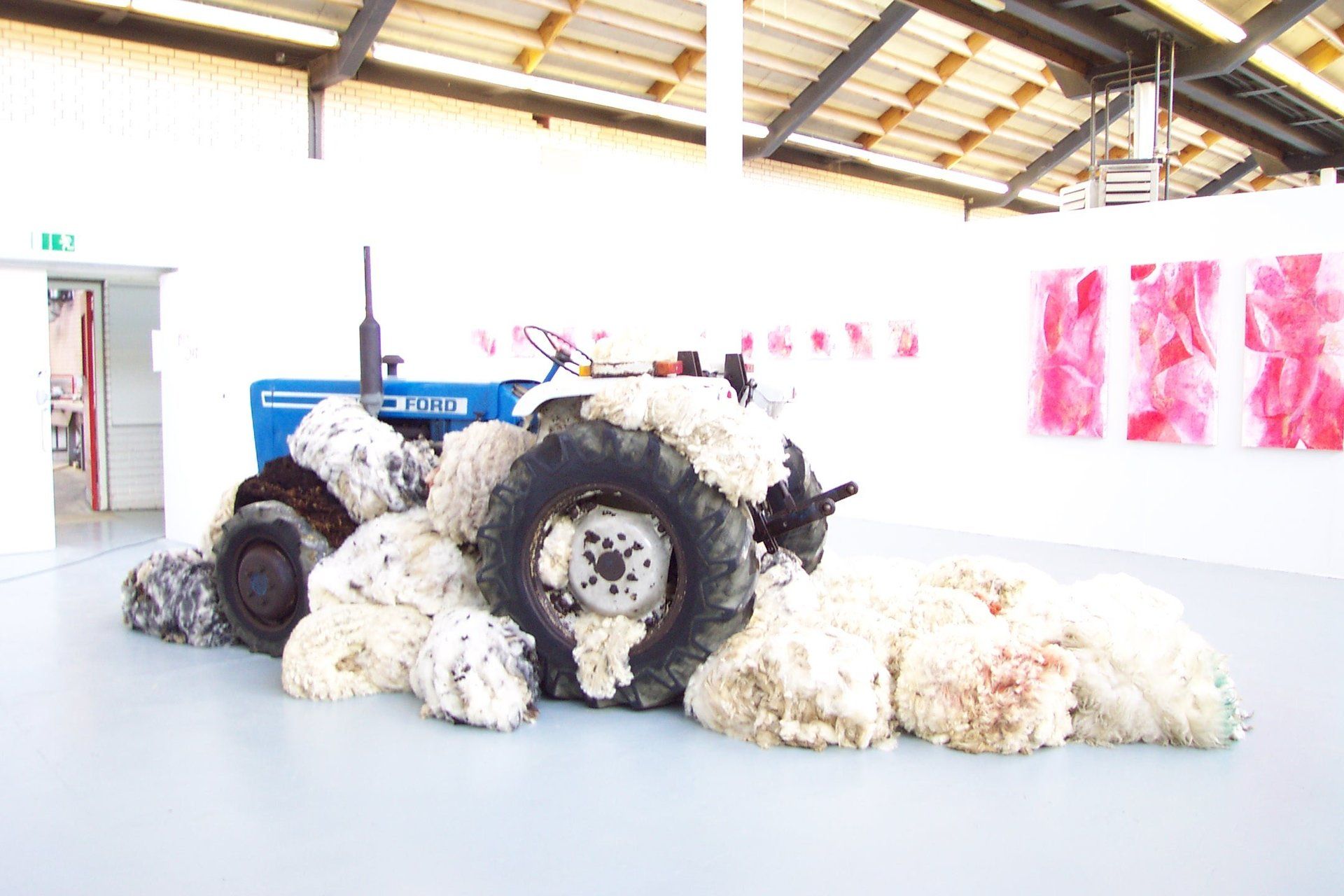 Newly shorn fleeces in a local farmer's field, then a tractor in the University Hall surrounded by the same fleeces, or a huge variety of pottery ani,als replacing the pupils for the annual school photo!